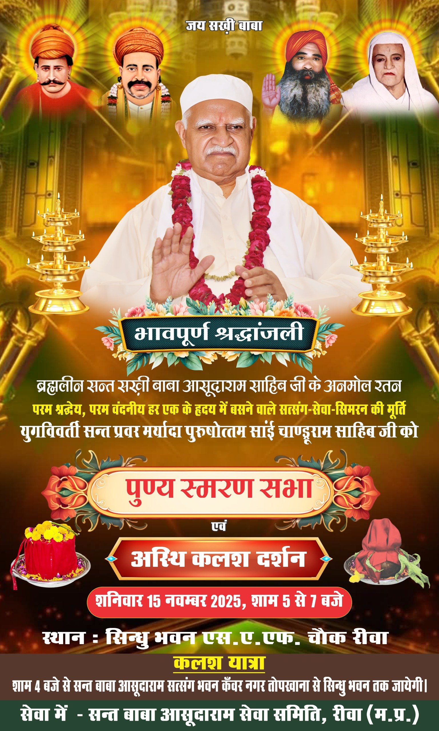 ब्रह्मलीन सन्त सखी बाबा आसूदाराम साहिब जी के अनमोल रतन परम श्रद्धेय, परम वंदनीय हर एक के हृदय में बसने वाले सत्संग-सेवा-सिमरन की मूर्ति युगविवर्ती सन्त प्रवर मर्यादा पुरुषोत्तम सांई चाण्डूराम साहिब जी की पुण्य स्मरण सभा एवं अस्थि कलश दर्शन